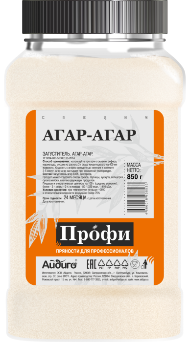 Порошок, названный агар-агар, получают из красных и бурых водорослей, которые произрастают на Белом и Черном море, а также в Тихом океане. Вязкость агар-агара в несколько раз превышает желатин. К тому же, он не плавится при комнатной температуре, поэтому лучше подходит для желе, тортов и других десертов. Сила агара - 900ш-г/см2, по валенту 2200-2400г/ см2.
