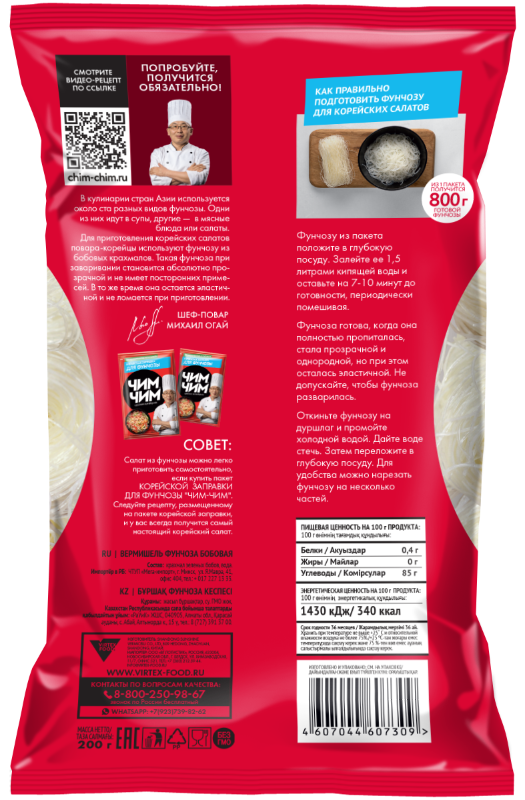 Фунчоза Чим-Чим - традиционная стеклянная лапша из зеленых бобов, широко используемая в рецептах азиатских стран. Этот вид фунчозы хорошо впитывает вкус и аромат соусов, дополняя любимые блюда уникальной текстурой и легкостью. Высокая питательная ценность и отличные насыщающие свойства делают её незаменимой частью здорового питания. Один пакет превращается в целых 800 граммов готового продукта!